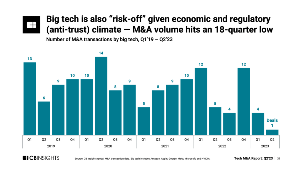 CBInsights: The economic and regulatory climate has brought big tech M&A activity to a near halt, with acquisitions reaching an 18-quarter low in Q2’23.