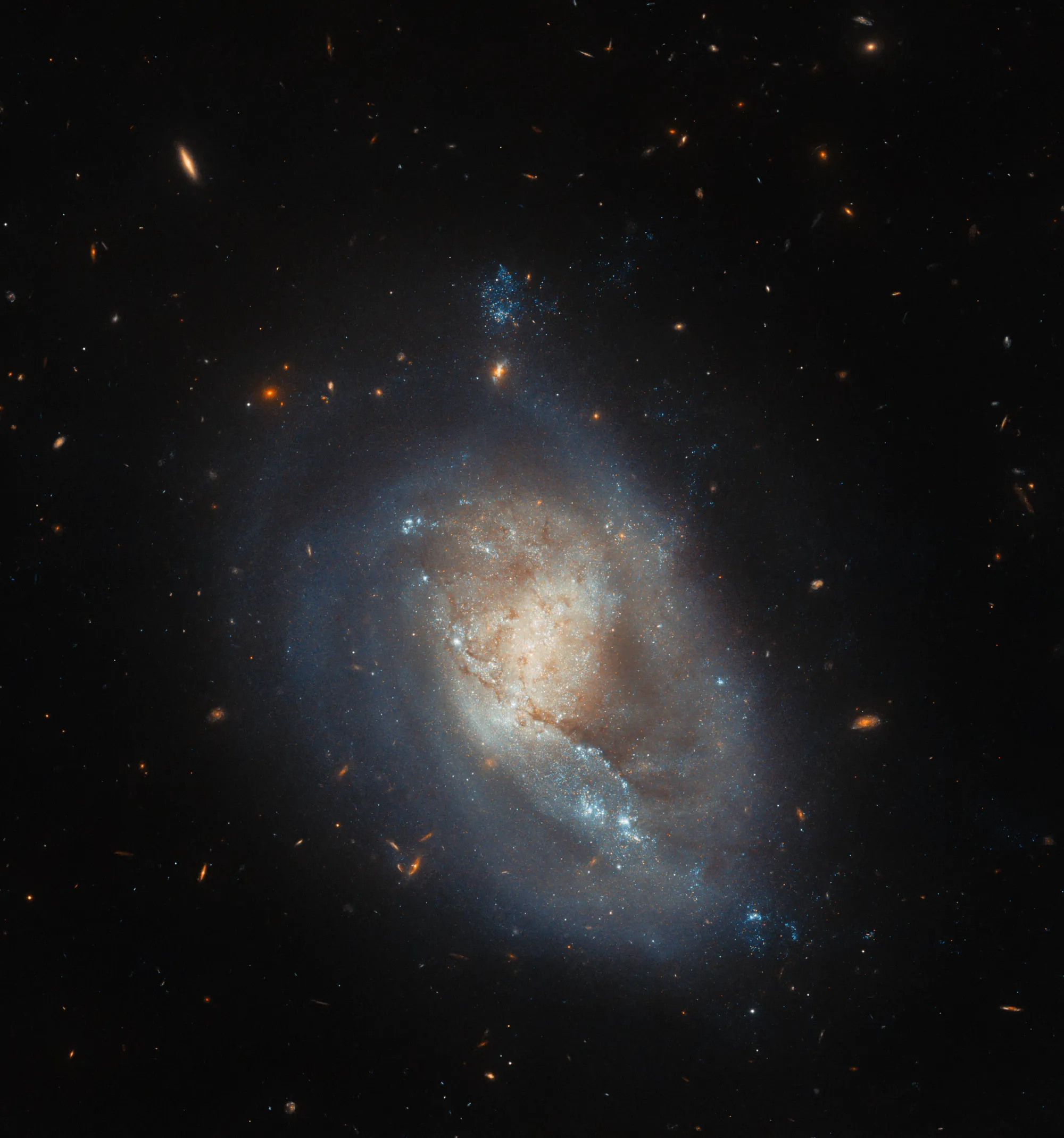 The gas and dust that permeates space exerts pressure on a galaxy as it moves. This resistance, called ram pressure, can strip a galaxy of its star-forming gas and dust, reducing or even stopping the creation of new stars. However, ram pressure can also compress gas in other parts of the galaxy, which can boost star formation. This may be happening in IC 3476. The galaxy appears to have absolutely no star formation along its edges, which bear the brunt of the ram pressure stripping, but star formation rates deeper within the galaxy are noticeably above average.