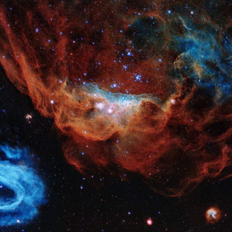 In this image celebrating Hubble’s 30th birthday, the giant red nebula (NGC 2014) and its smaller blue neighbor (NGC 2020) are part of a vast star-forming region in the Large Magellanic Cloud, a satellite galaxy of the Milky Way, located 163,000 light-years away. The image is nicknamed the “Cosmic Reef,” because NGC 2014 resembles part of a coral reef floating in a vast sea of stars. Some of the stars in NGC 2014 are monsters. The nebula’s sparkling centerpiece is a grouping of bright, hefty stars, each 10 to 20 times more massive than our Sun. The seemingly isolated blue nebula at lower left (NGC 2020) has been created by a solitary mammoth star 200,000 times brighter than our Sun. The blue gas was ejected by the star through a series of eruptive events during which it lost part of its outer envelope of material.
